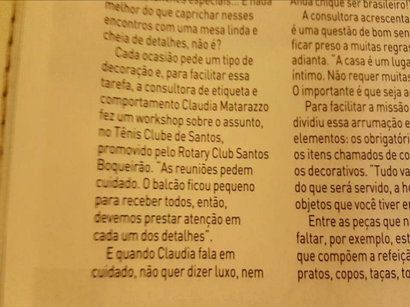 O Workshop Beneficente com Cláudia Matarazzo teve tamanha repercussão na cidade que gerou uma matéria de três páginas sobre o evento na Revista AT, encartada no Jornal A Tribuna. Além da divulgação do trabalho realizado pelo Rotary coo instituição, as ações do clube em prol da comunidade local também são valorizadas.