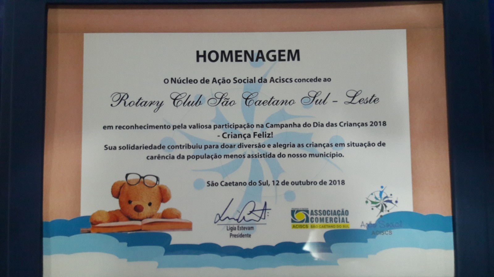 A Presidente da ACISCS (Associação Comercial de São Caetano do Sul), Ligia Estevam esteve presente no Rotary Club de São Caetano do Sul Leste para entregar uma placa de agradecimento ao Club pela participação do Projeto Criança Feliz.