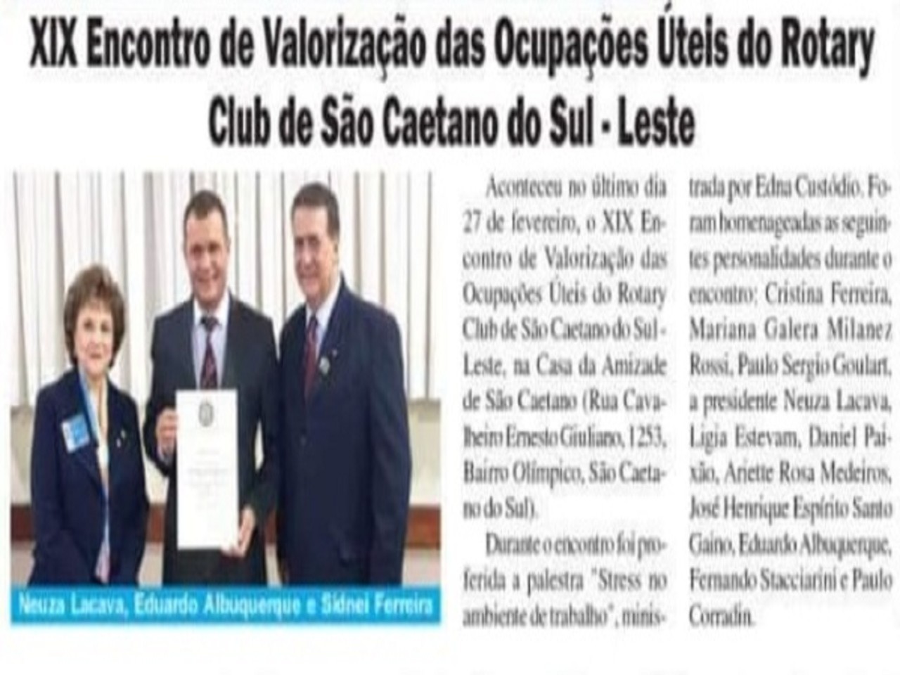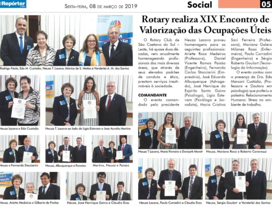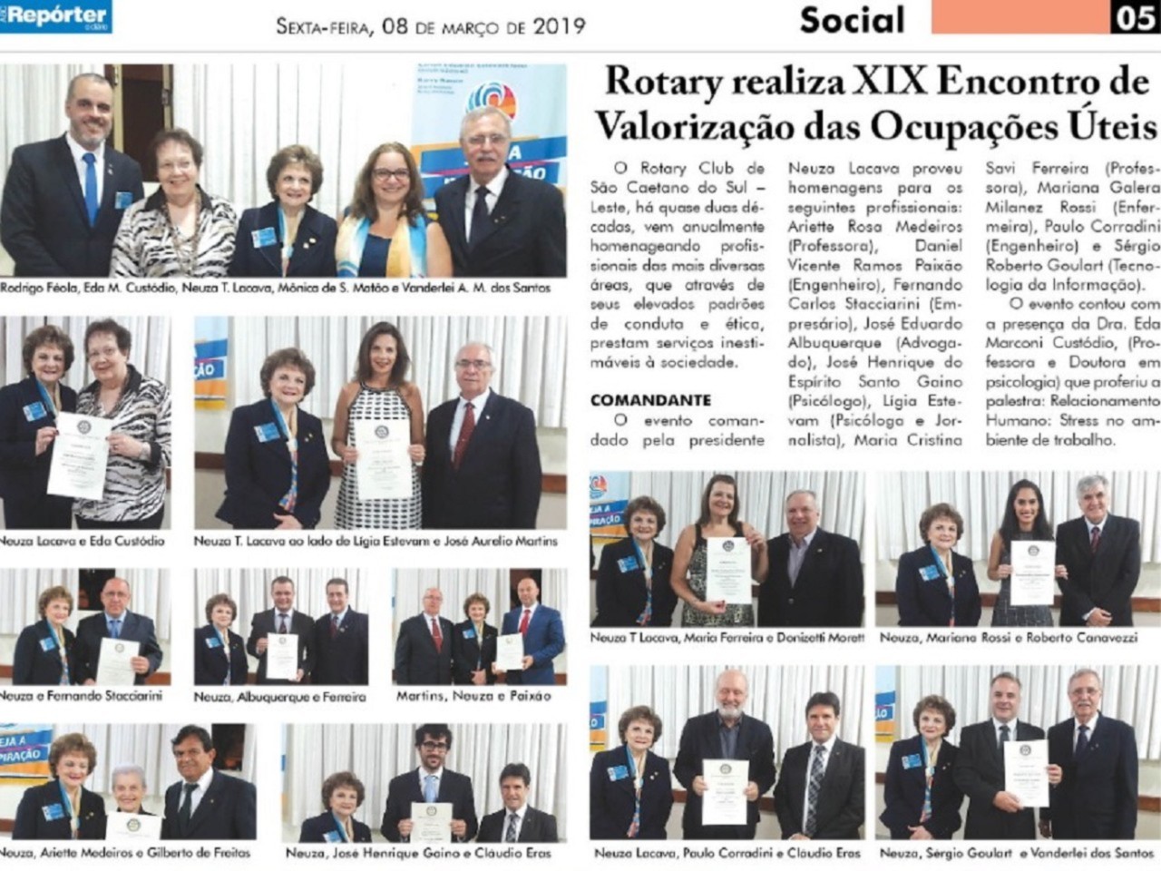O Rotary Club de São Caetano do Sul Leste, foi destaque na imprensa da região no seu evento do ENCONTRO DE VALORIZAÇÃO E OCUPAÇÕES ÚTEIS, onde foram homenageados profissionais.